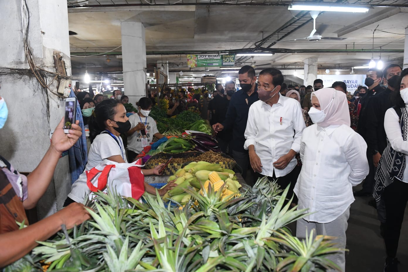 Selepas membeli sate, Presiden Jokowi dan Ibu Iriana beranjak ke dalam pasar dan tampak menghampiri penjual buah dan sayur. Presiden Jokowi tampak membeli jagung, sementara Ibu Iriana membeli buah mangga kweni dan jambu merah.