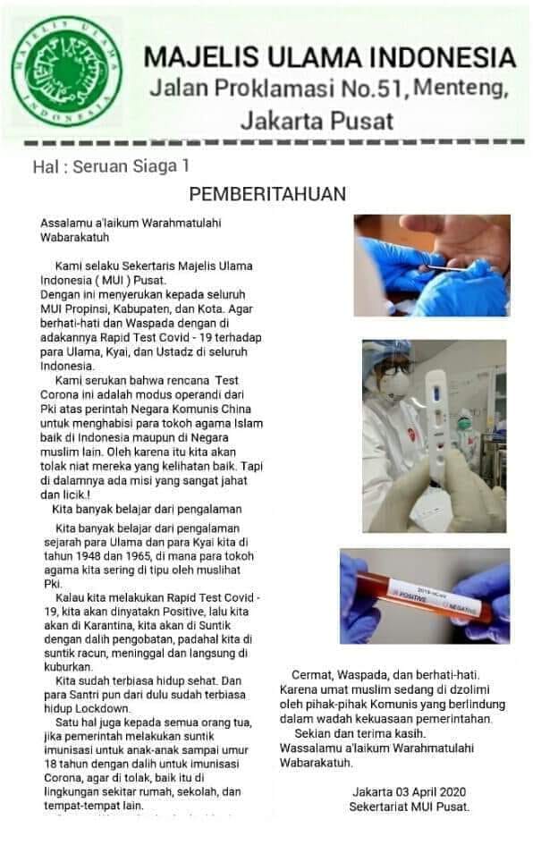 Dewan Pimpinan MUI Pusat menegaskan, tidak pernah mengeluarkan seruan agar ulama, kiai, dan ustaz di Indonesia menolak rapid test Covid-19. Dewan Pimpinan MUI Pusat menyatakan kabar tersebut tidak sesuai dengan standar penerbitan surat, pengumuman, pemberitahuan atau sejenisnya di organisasi MUI.