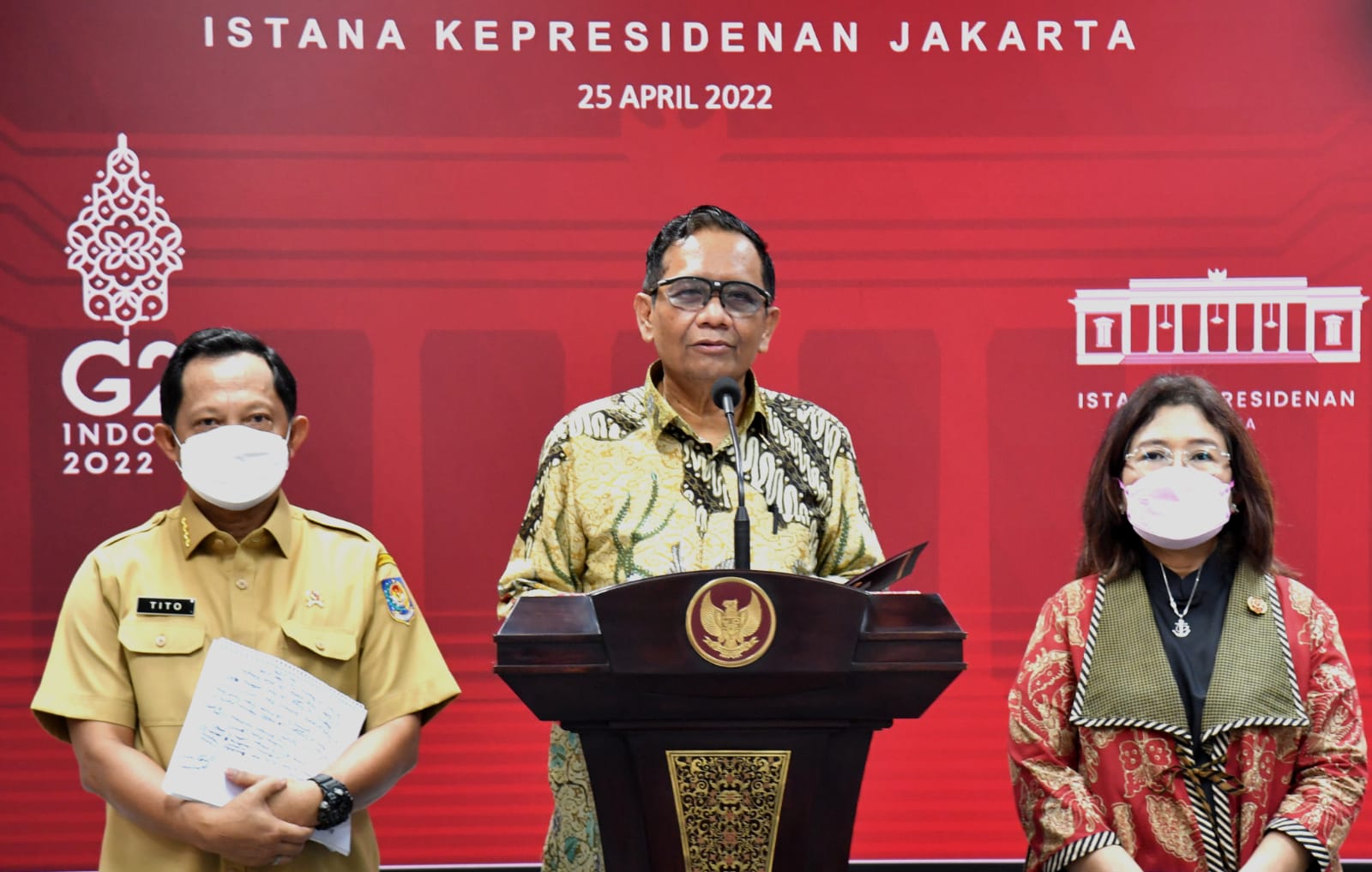 Menko Polhukam Mahfud MD didampingi Mendagri Tito Karnavian dan Deputi V KSP Jaleswari Pramodawardhani memberikan keterangan pers di Kantor Presiden, Jakarta, Senin (25/04/2022). (Foto: BPMI Setpres/Rusman)
