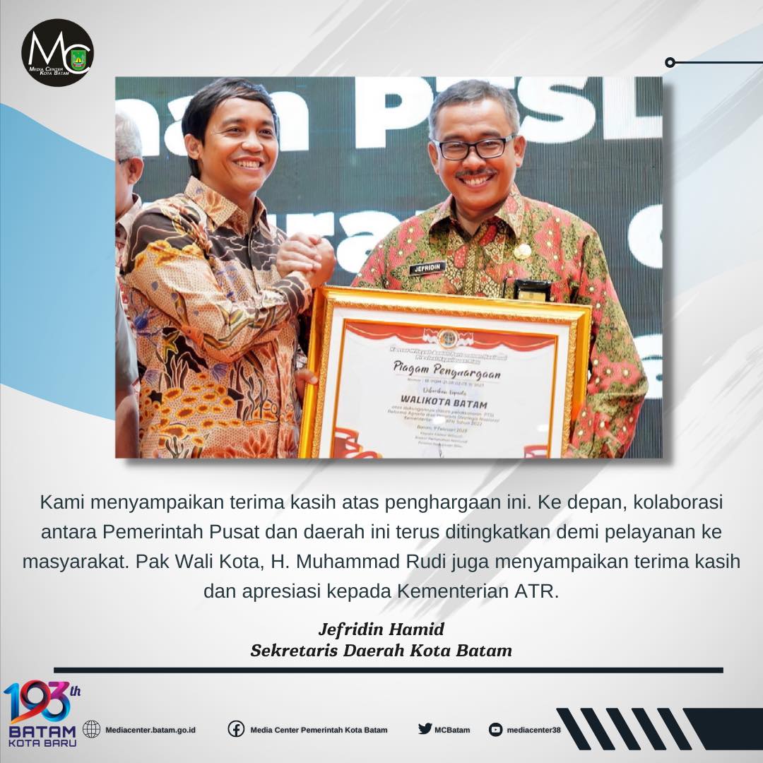 𝗗𝗶𝘀𝗸𝗼𝗺𝗶𝗻𝗳𝗼 𝗕𝗮𝘁𝗮𝗺- Sekretaris Daerah (Sekda) Batam, Jefridin Hamid, mewakili Wali Kota Batam, Muhammad Rudi, menerima penghargaan dari Kementerian Agraria dan Tata Ruang / Badan Pertanahan Nasional (ATR/BPN).