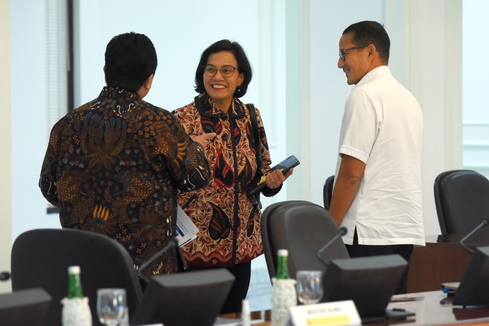 Menparekraf Sandiaga Uno, Menkeu Sri Mulyani, dan Menteri BUMN Erick Thohir berbincang sebelum Ratas mengenai Peningkatan Aktivitas Perekonomian dan Pariwisata Pasca Pencabutan PPKM, Senin (30/01/2023), di Kantor Presiden, Jakarta. (Foto: Humas Setkab/Agung)