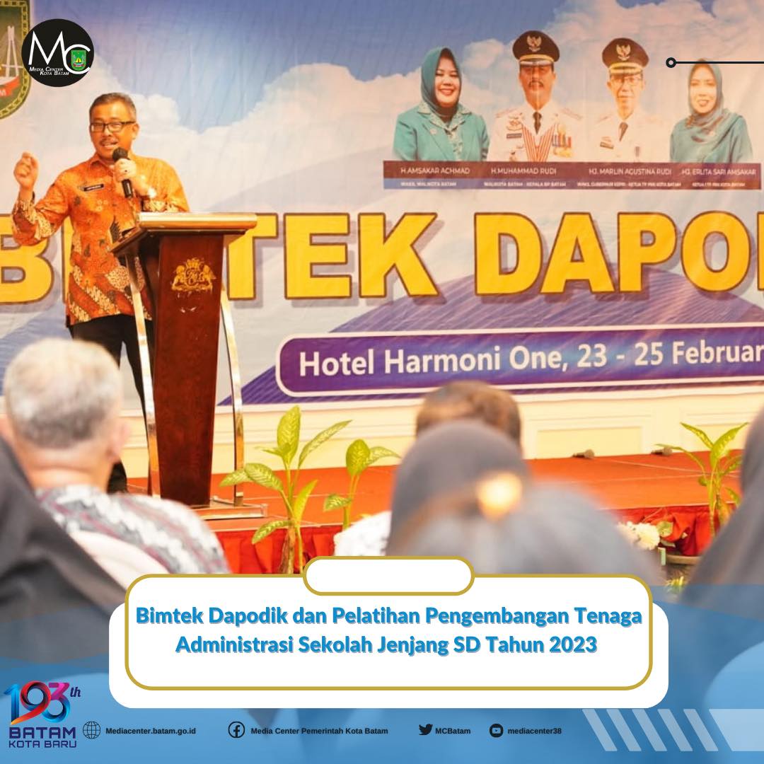 MC Pemko Batam – Sekretaris Daerah (Sekda) Kota Batam Jefridin Hamid mewakili Wali Kota Batam Muhammad Rudi membuka Bimtek Dapodik dan Pelatihan Pengembangan Tenaga Administrasi Sekolah Jenjang SD Tahun 2023 di Harmoni One Hotel & Convention Centre, Kamis (23/2) pagi.