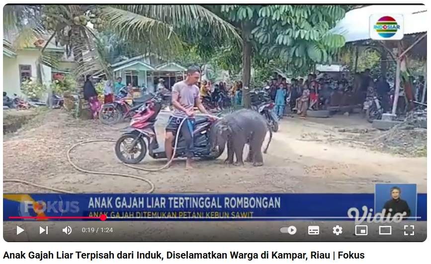 Seketika anak gajah Sumatra (Elephas maximus sumatranus) itu menarik perhatian warga setempat, dan mereka berbondong datang melihatnya. Rekaman video yang beredar di media sosial menunjukkan bayi gajah mungil dikerumuni oleh orang-orang, lokasinya di area perkebunan sawit. Tingginya seukuran sepeda motor. Ia tak terlihat takut, bahkan sempat dimandikan oleh seorang warga.