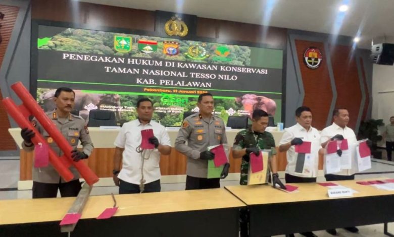 Cakrawalatoday.com — Tim gabungan Direktorat Reserse Kriminal Khusus (Ditreskrimsus), Direktorat Reserse Kriminal Umum (Ditreskrimum), serta Satuan Tugas Penertiban Kawasan Hutan (Satgas PKH), melakukan konferensi pers mengamankan 9 orang terkait jual beli dan pengrusakan fasilitas satgas di kawasan Taman Nasional Teso Nilo (TNTN). Ekspos digelar di ruang media center Polda Riau, Rabu (21/1/2026), dipimpin Wakil Kepala Polda Riau, Hengky Hariyadi, Pangdam XIX Tuanku Tambusai, Agus Hadi, Kajati Riau Sutikno, serta diikuti Dirreskrimsus dan Direskrimum Polda Riau.